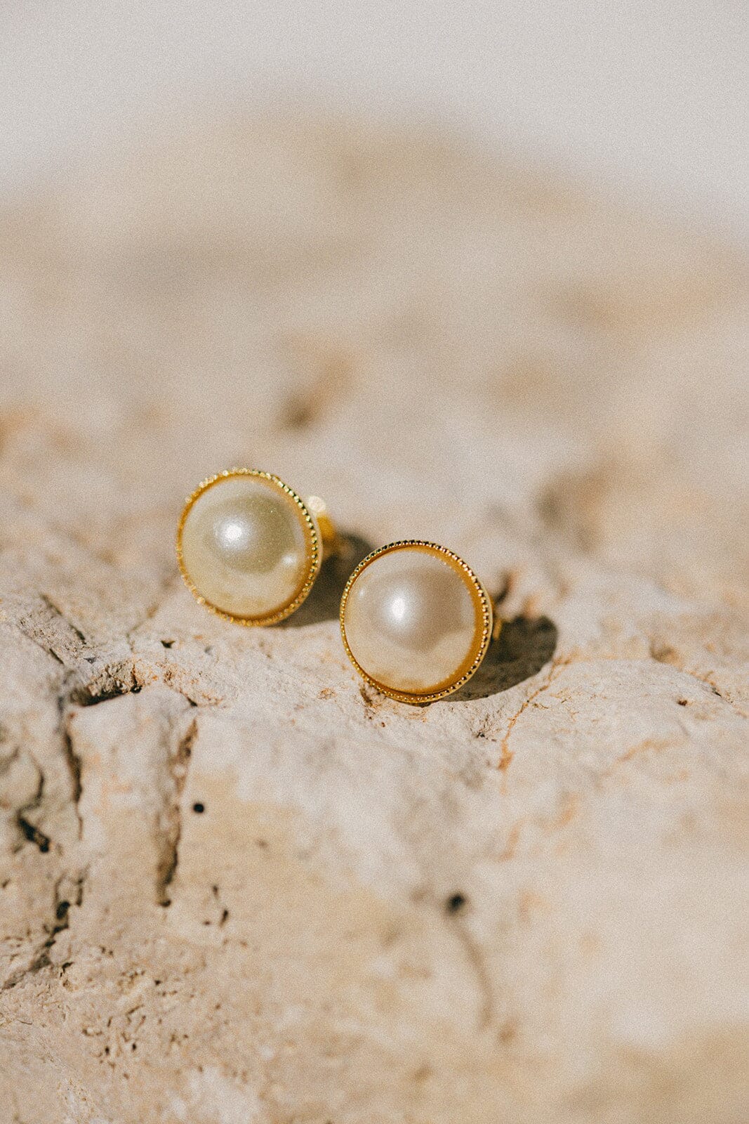 Mini boucles d'oreilles puces Nélya - Ø 1 cm - en laiton doré à l'or fin 24k recyclé et certifié RJC-COC avec deux perles cabochons crèmes. Les tiges d'attache et fermoirs sont en argent 925 afin d'éviter tout risque d'allergie.