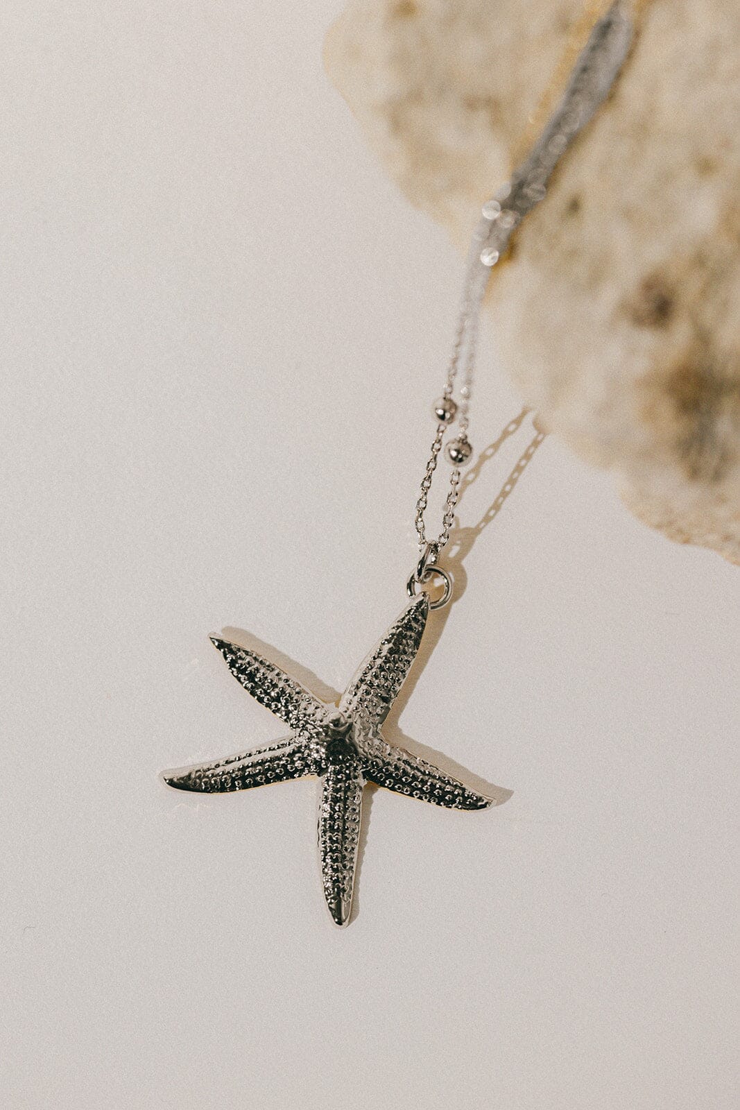 Sautoir Cléia en laiton plaqué argent avec une chaîne boules - 80 cm - et une étoile de mer. Chaîne de réglage de 3 cm, fermoir mousqueton et médaillon gravé du logo.