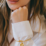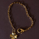 Maxi bracelet Léon en laiton doré à l'or fin 24k recyclé et certifié RJC-COC avec un trèfle. Anneaux de réglage et fermoir mousqueton.