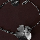 Bracelet Orphée en laiton plaqué argent avec une chaîne boules et une fleur creuse. Chaîne de réglage de 3 cm, fermoir mousqueton et médaillon gravé du logo.