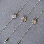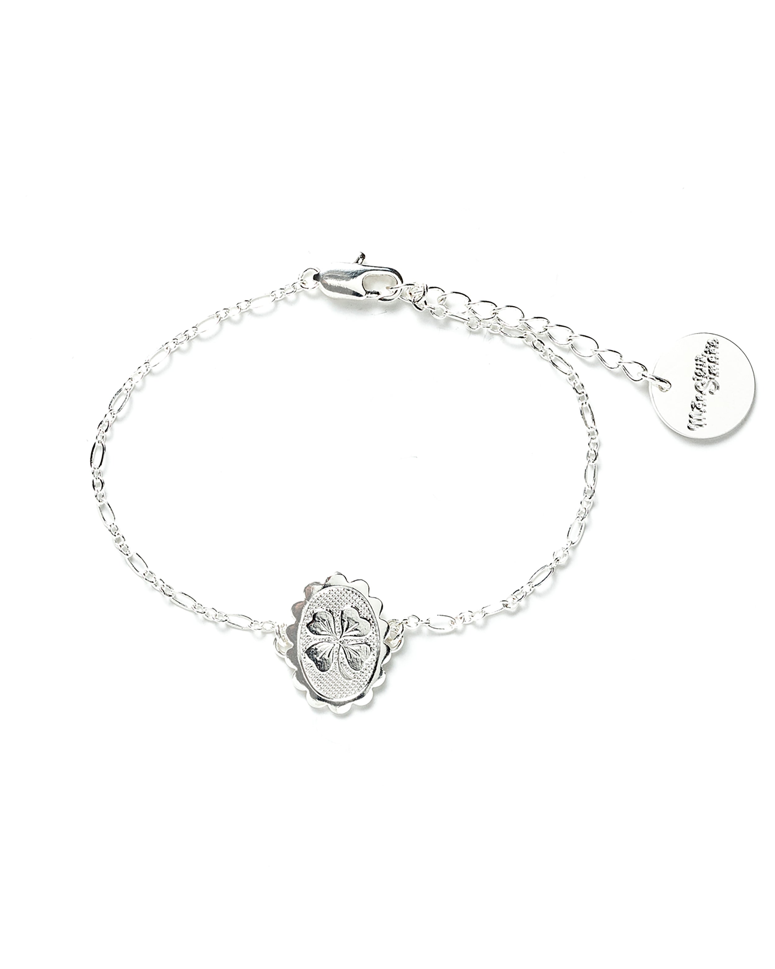 Bracelet Thémis en laiton plaqué argent avec une chaîne forçat et un médaillon gravé avec un trèfle à quatre feuilles. Chaîne de réglage de 3 cm, fermoir mousqueton et médaillon gravé du logo.