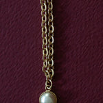 Collier Nélya en laiton doré à l'or fin 24k recyclé et certifié RJC-COC avec une chaîne forçat - 40 cm - et une perle cabochon crème Ø 1 cm. Chaîne de réglage de 3 cm, fermoir mousqueton et médaillon gravé du logo.
