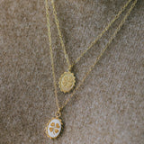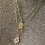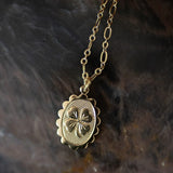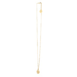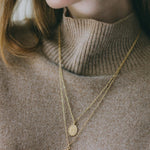 Collier Thémis en laiton doré à l'or fin 24k recyclé et certifié RJC-COC avec une chaîne forçat - 55 cm - et un médaillon gravé avec un trèfle à quatre feuilles. Chaîne de réglage de 3 cm, fermoir mousqueton et médaillon gravé du logo.