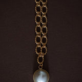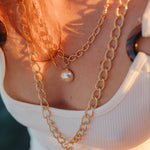Maxi collier Nélya en laiton doré à l'or fin 24k recyclé et certifié RJC-COC avec une chaîne maille double anneaux - 50 cm - et une perle cabochon crème Ø 1,8 cm. Chaîne de réglage de 3 cm, fermoir mousqueton et médaillon gravé du logo.
