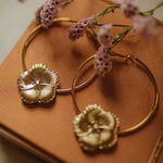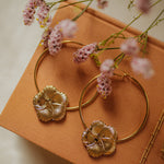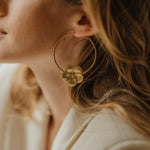 Boucles d'oreilles créoles Hélios - Ø 5,5 cm - en laiton doré à l'or fin 24k recyclé et certifié RJC-COC avec deux fleurs rondes.