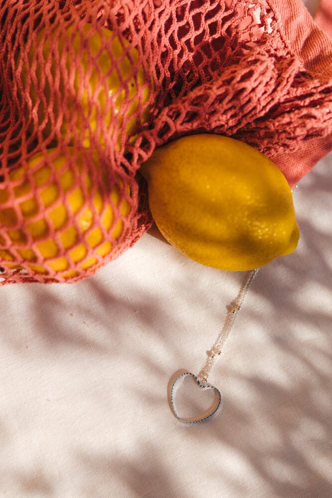 Aura necklace in silver-plated brass with a ball chain - 80 cm - and a heart. 3 cm adjustment chain, lobster clasp and medallion engraved with the logo.