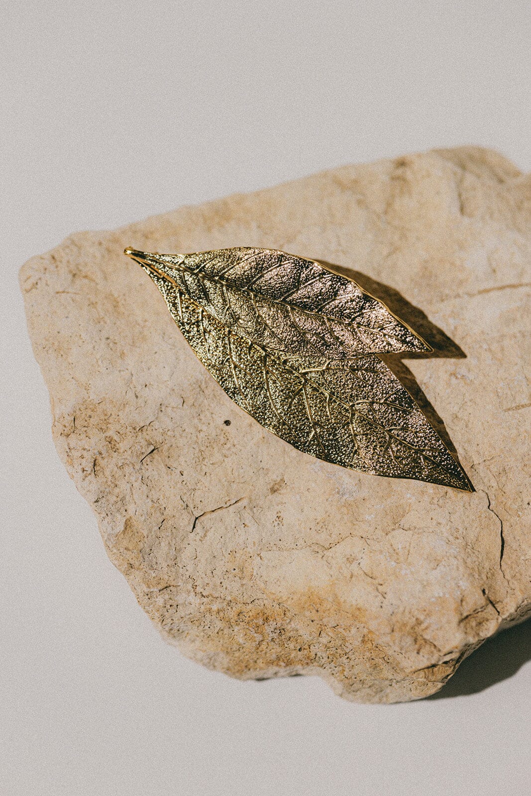 Thalie brooch in brass gilded with recycled 24k fine gold and RJC-COC certified - length 6.5 cm - with two leaves.